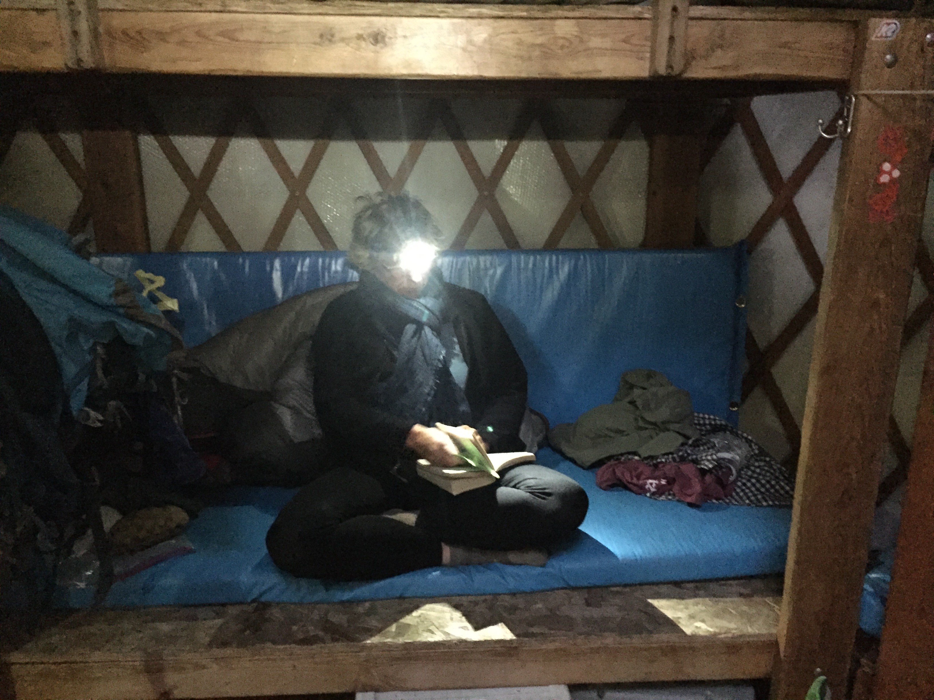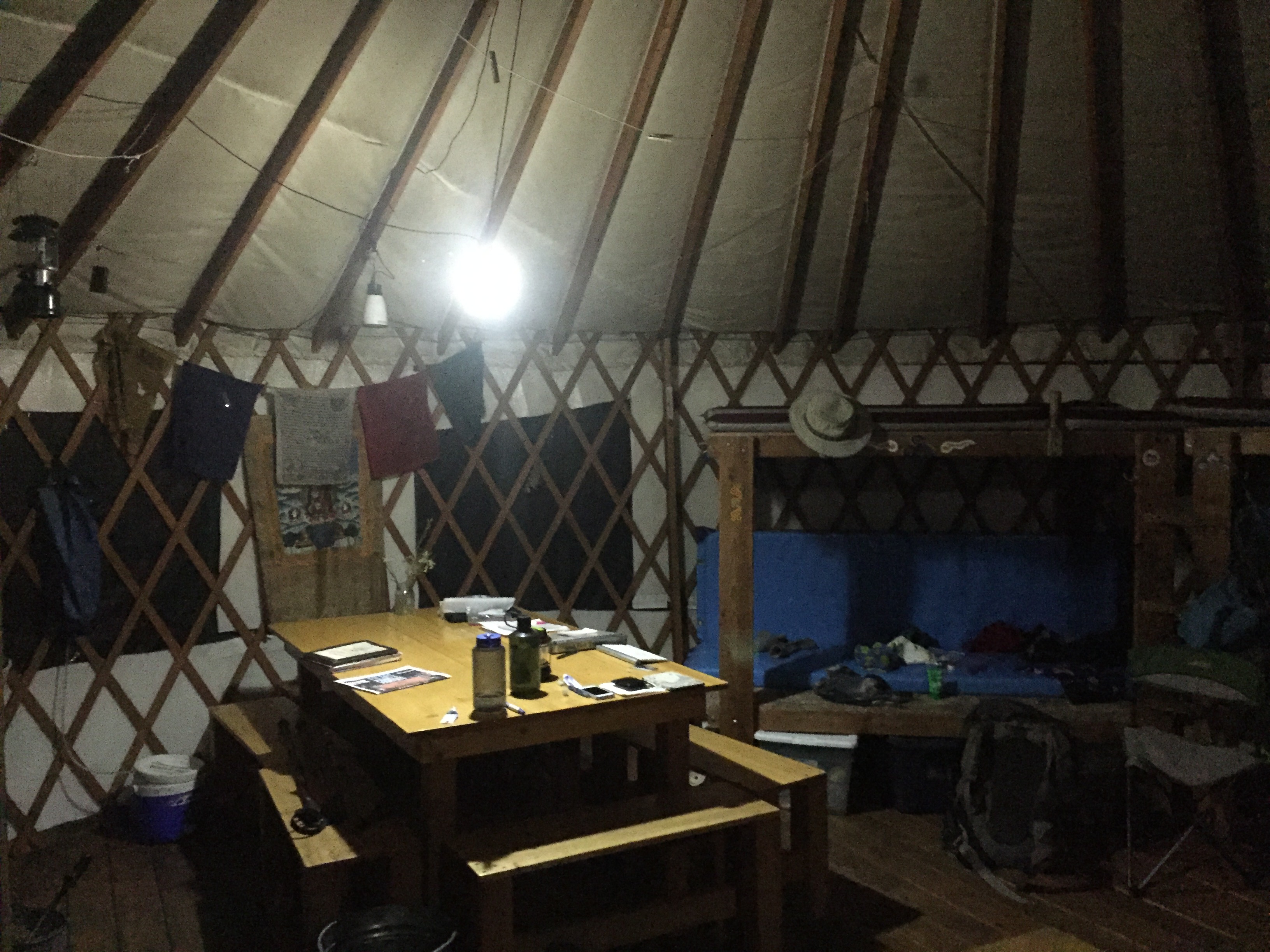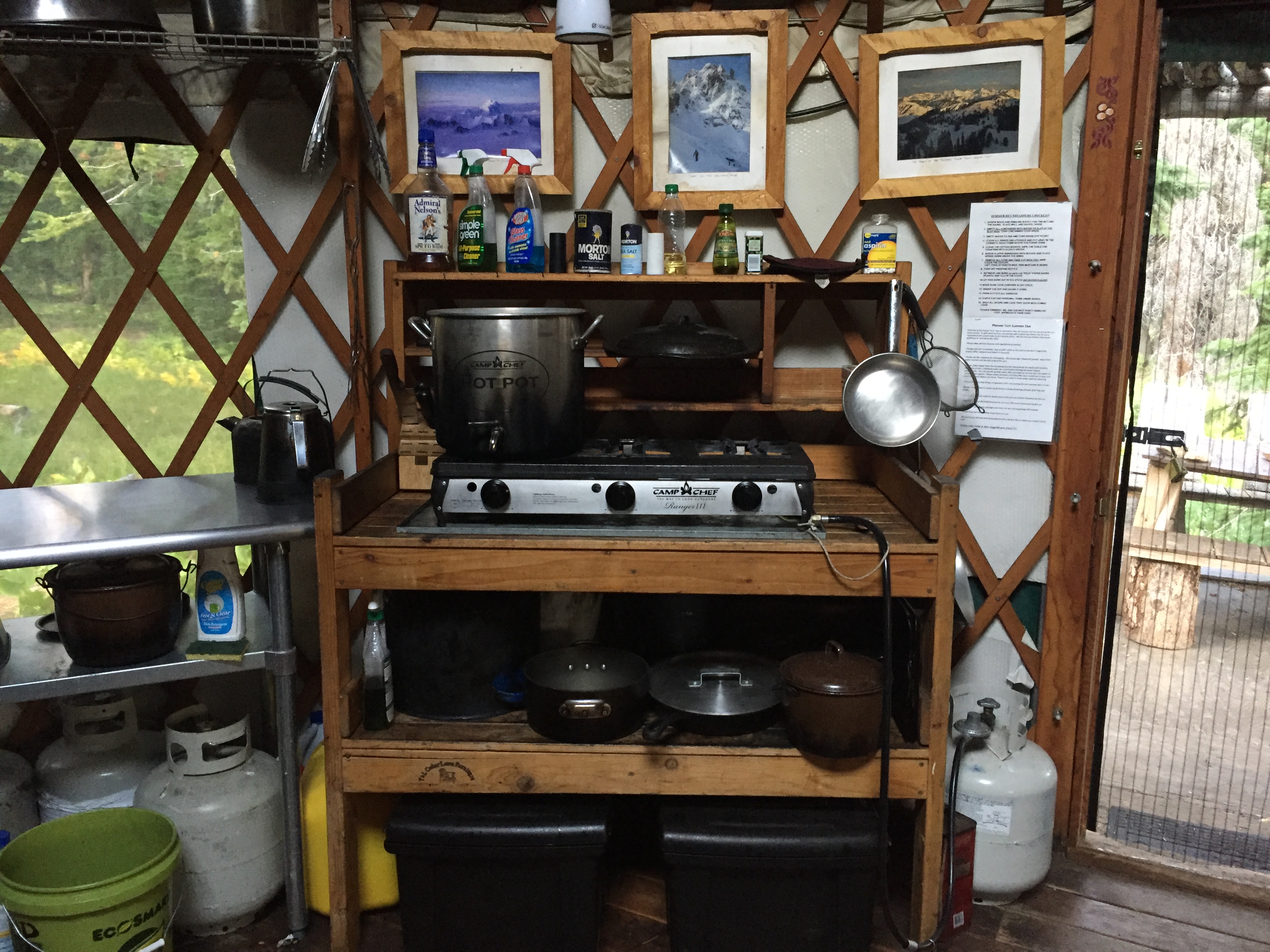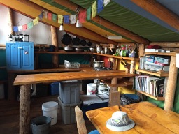 The amenities are thoughtfully honed over years of experience in mountain hospitality.  The yurt sleeps up to 16 people in four bunk beds, each with comfortable plastic covered mattresses.  The wood stove keeps the yurt warm.  There are lots of clothes lines and hooks for hanging wet clothing to dry.  Water for drinking and cooking is from snow melt in winter and from nearby Hyndman Creek in summer (gravity filter provided).  The kitchen has a three burner propane stove and all the implements needed for cooking and eating, including a small BBQ.  There are tables for indoor and outdoor eating and lounging, and foldable chairs for reading and sitting in the meadow or under the stars.   The Goal Zero solar collector system feeds a battery which powers lights, lanterns, a speaker system, and recharges GPS units and personal devices.  A selection of games and reading material, along with the hut log, provide quiet entertainment options.