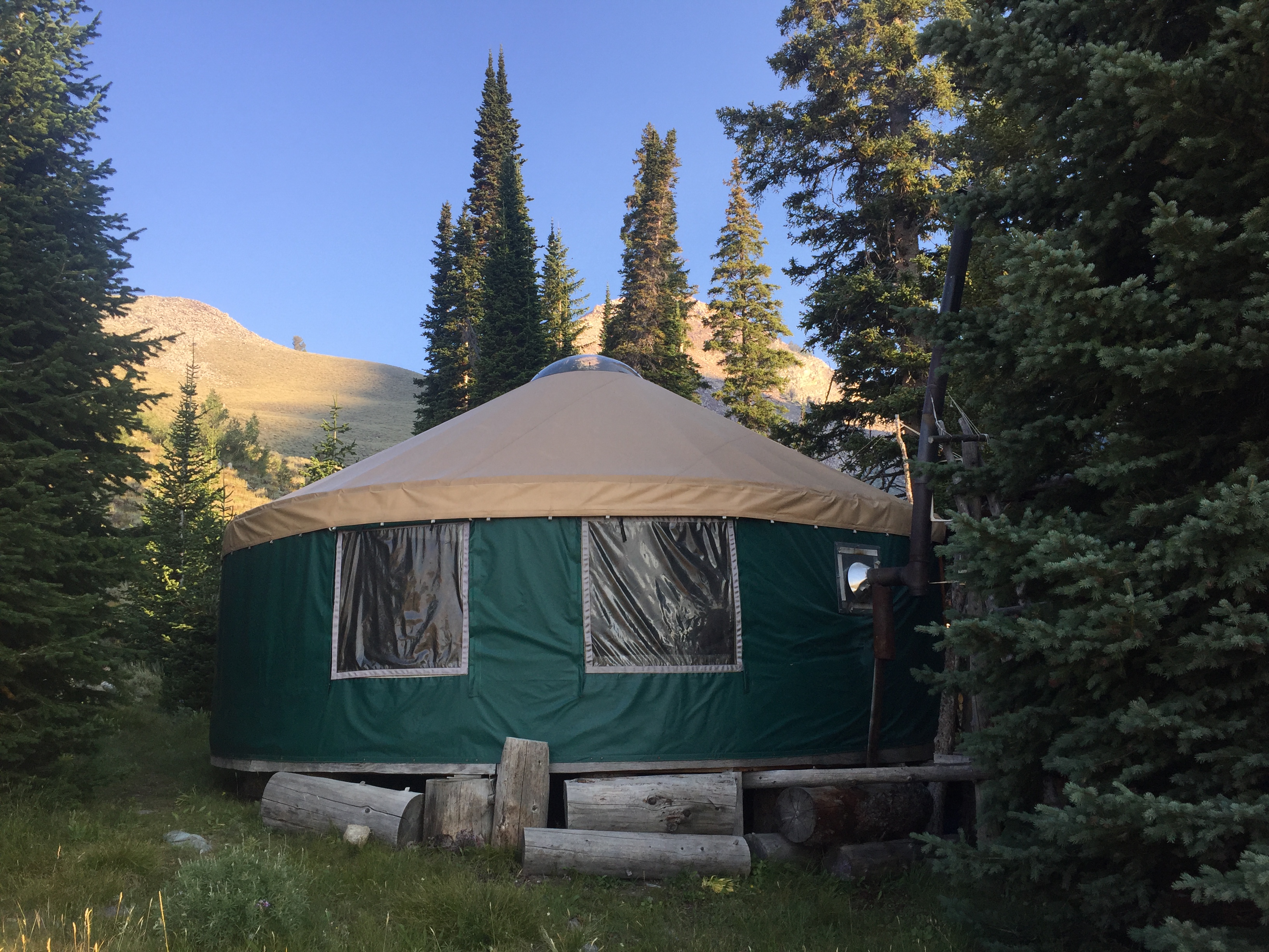 Fishook Hut and Yurt sit at 6,800’ next to meandering Fishook creek and beautiful meadows on the edge of the Sawtooth Mountains wilderness area.  The jagged mountains rise above the meadow, with spectacular views of Thompson Peak (the highest in the Sawtooth Mountain).  Fishook has the same level of amenities as Pioneer, described above, and is distinguished by three features: topography, history, type of accommodation, and a hot tub.