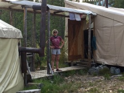 The 16’ diameter Mongolian yurt is nicely appointed and sleeps 8, and is joined together by a lodge-pole pine framed walkway to a pioneer style wall tent that sleeps 6.  The wall tent, the site of cooking and dining, is appointed with colorful panels and a gorgeous fabric doorway.  There are two covered outhouses. The piece de resistance is a wood fired hot tub.