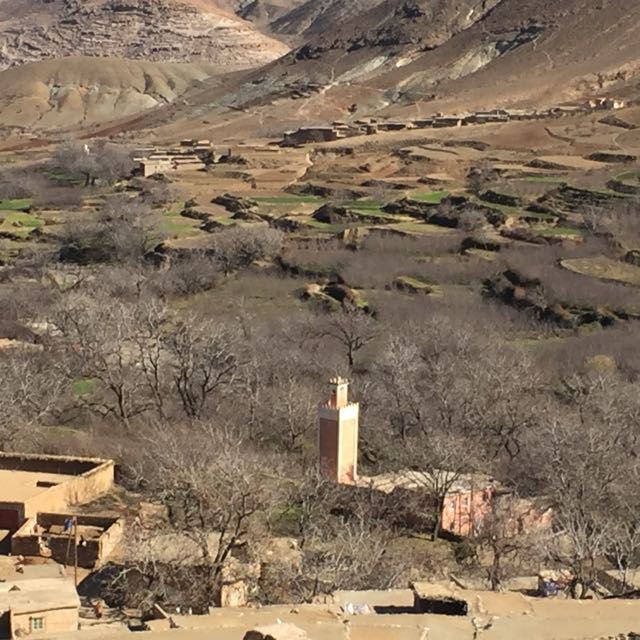 Dry open country alternated with cultivated fields and a thick pine forest throughout the afternoon. Finally, as we made our way around to the other side of the front range, signs of intense cultivation greeted us – orchards, green terraces, all fed by irrigation ditches. We had arrived at our first overnight spot – Mohammad’s home village – and indeed, Mohammad’s family compound. His dwelling unfolded on the hillside; walls contained a rough space for the mule, and then a doorway into a rectangular courtyard circled by rooms including our bedroom and the all-important kitchen set into the corner of the complex. Mohammad’s wife, daughter-in-law, and two young grandsons made us welcome as we relaxed over tea. That night we feasted on the first of twice-daily tagines (just about) – made with fish purchased in the market down below in Amizmiz.