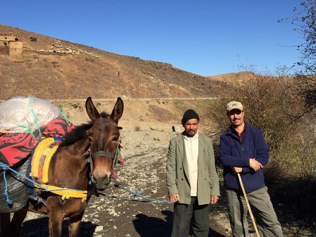 Taking advantage of cheap international flights from my 2015-16 homebase of Dublin, Ireland, my husband and I travelled to Morocco for the 2015 Christmas season. Avid hikers, we sought access to mountains near Marrakech, our debarkation point. We found the perfect opportunity to walk 4-6 hours daily through agricultural valleys and rocky or forested mountains, and to experience the particular pleasures of Berber culture with a five day, four night journey organized by Berber Travel Adventures, a small company based in Amazmiz (55 km from Marrakech). Jamal, the sole proprietor and trained mountain guide, led the way. We were also accompanied by Mohammad, an able and cheerful muleteer, and by Maria, the patient beast of burden. They put together a great trip for us!