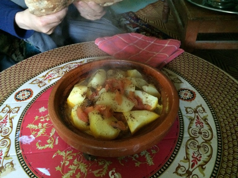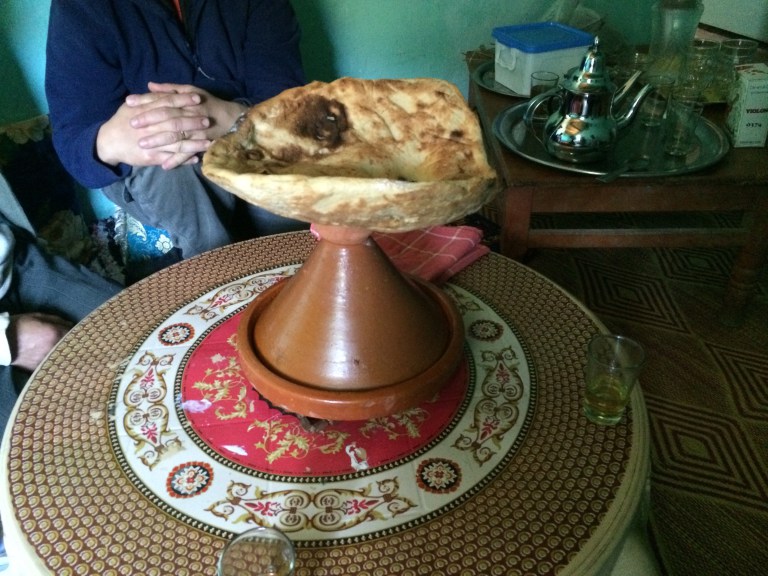 Morning sought warmth with the family in the kitchen, where bread was being prepared in the open-topped round fireplace/oven. I accepted a pre-breakfast snack of warm white gruel made from flour, barley, water and salt (villagers work long hours, taking small meals every few hours at home). Our regular breakfast was served after we had packed our belongings; we enjoyed flatbread (its distinctive curved shape derived from the fireplace/oven), olive oil, hard-boiled eggs, olives, honey and fresh butter AND the ubiquitous Moroccan tea – a blend of green tea, mint, other herbs, and sugar.